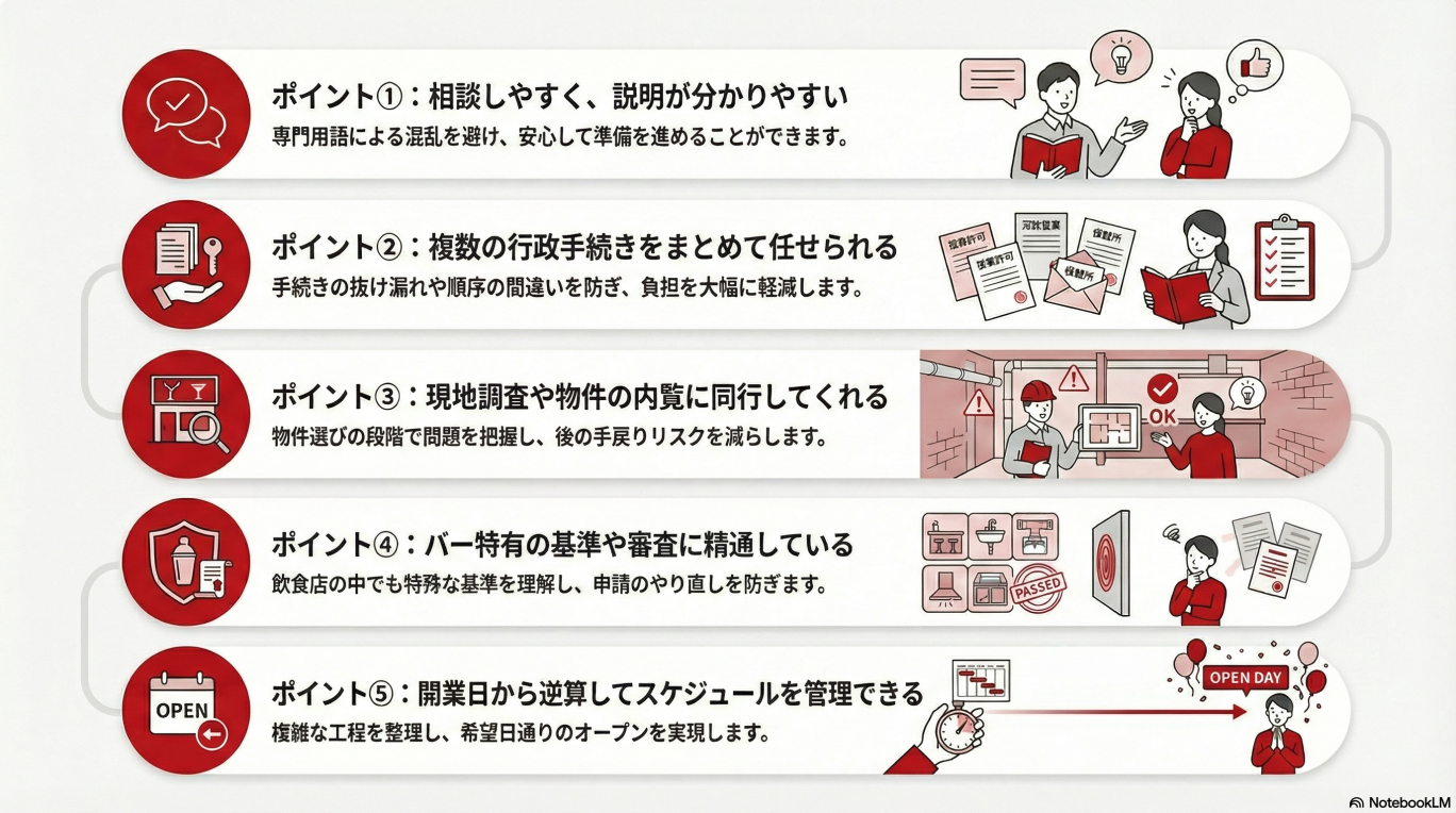 バー開業で最も大切なのは、あなたの計画に寄り添いながら、基準や手続きを分かりやすく整理してくれる相手を選ぶことです。