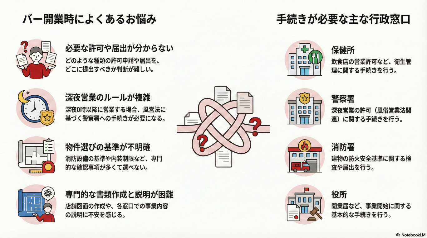 飲食店営業許可や深夜営業の届出、防火管理の条件確認など、手続きが分かれているため迷いやすいのは当然です。