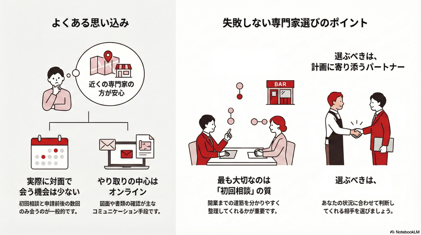 しかし、バー開業の手続きを進めるうえで本当に大切なのは、物理的な距離ではなく、“初回相談でどれだけ状況を整理できるか”という点です。